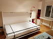 Перегородка позволила разделить большую комнату на две зоны. Такой вариант полноценной двухспальной кровати в собранном виде экономит свободное пространство в комнате.